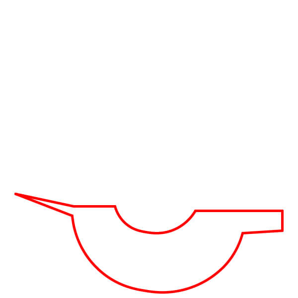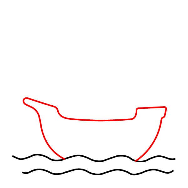 Comienza dibujando el contorno exterior del casco del barco. Esta forma es redondeada en la parte inferior, tiene una proa puntiaguda (frente), una popa alta y plana (parte trasera) y un corte ancho en forma de U para la cubierta central.