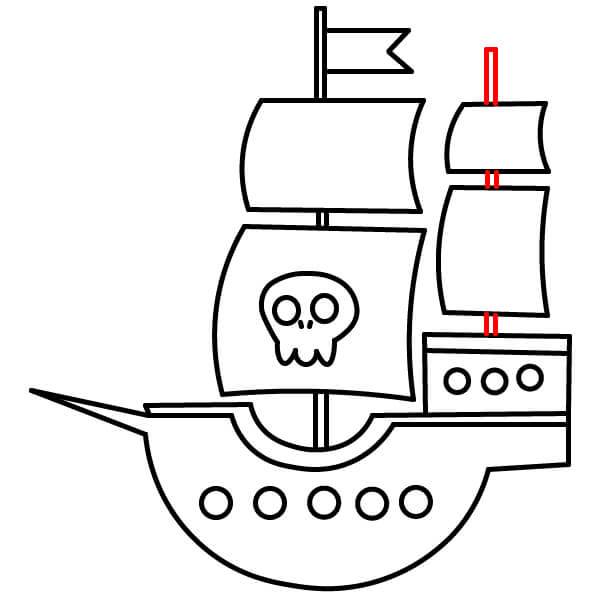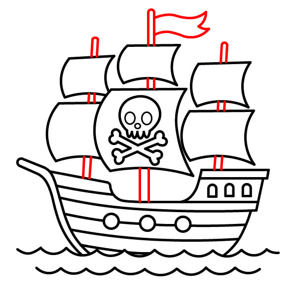 Añade pequeñas banderas triangulares en la parte más alta de ambos mástiles. Esto completa tu barco pirata de estilo caricatura.