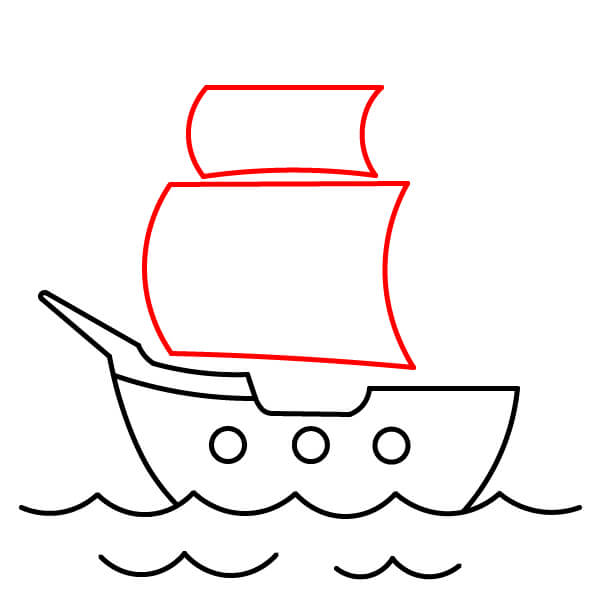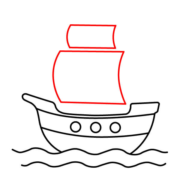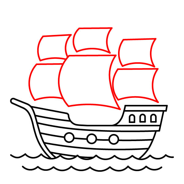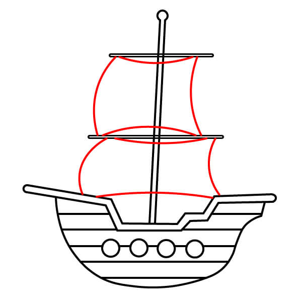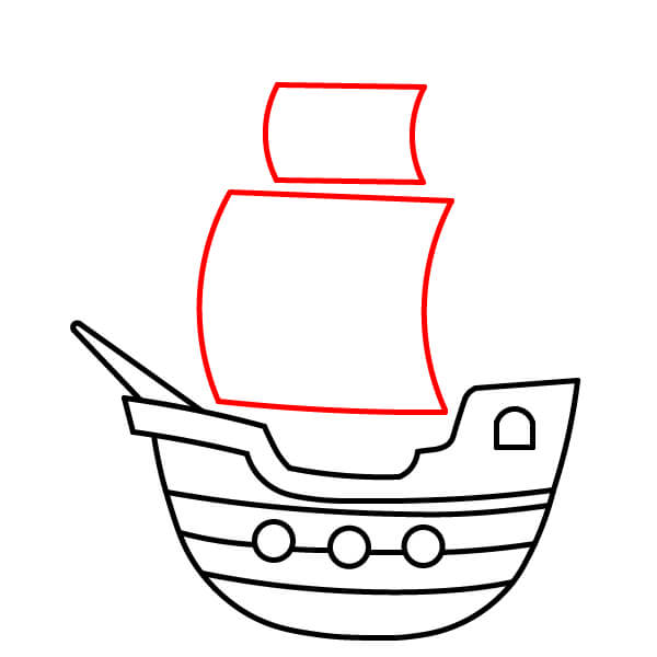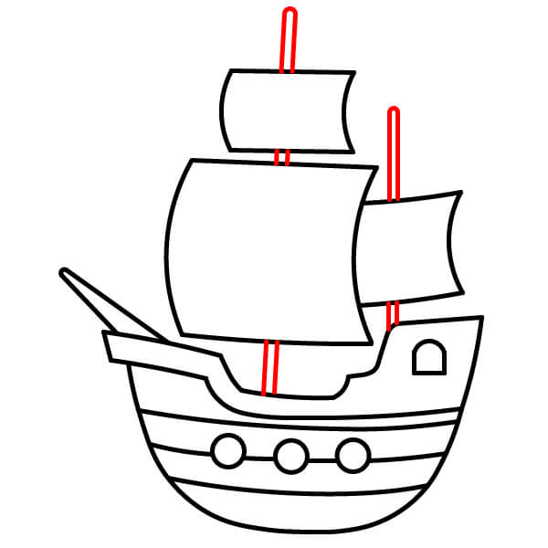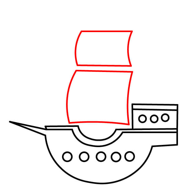 Dibuja dos mástiles principales (líneas verticales) que se eleven desde las zonas de la cubierta. Luego dibuja cuatro velas – dos en cada mástil – usando formas rectangulares curvas para que parezcan llenas de viento.