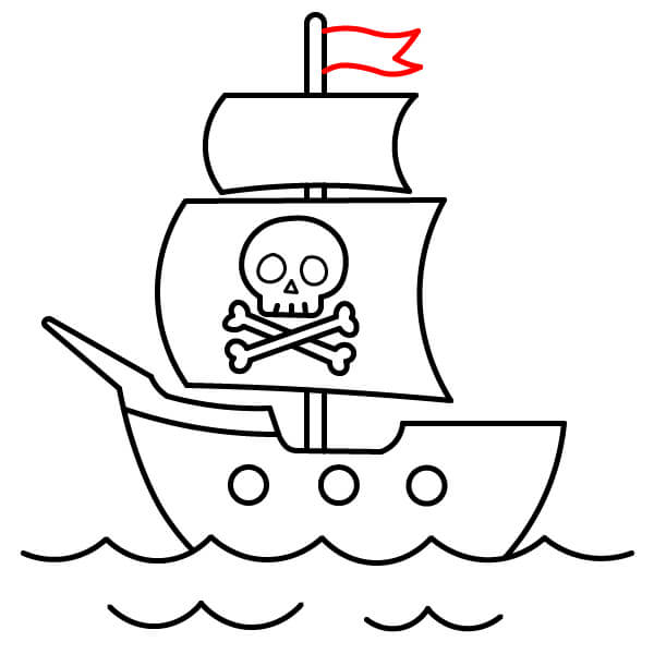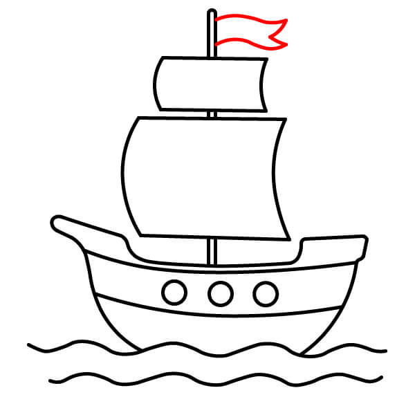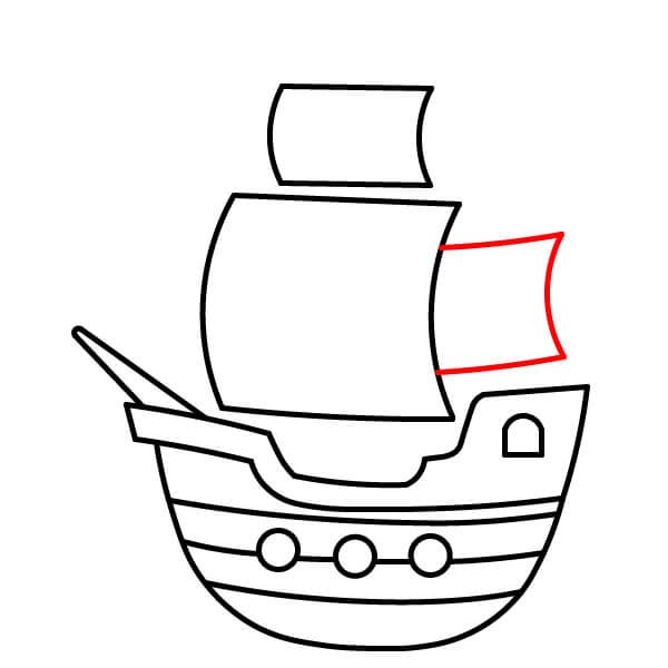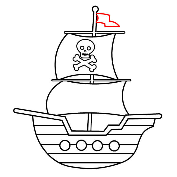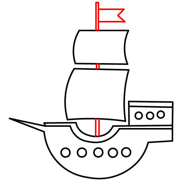 Dibuja una pequeña bandera o banderín con punta bifurcada en la parte más alta del mástil, encima de la vela superior. Debe parecer que está ondeando con el viento.