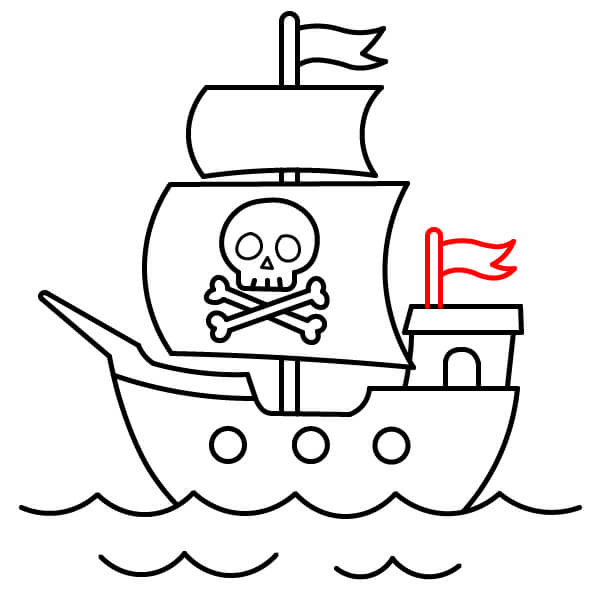 Encima de la estructura de la cabina, dibuja un poste corto con otra pequeña bandera o banderín con punta bifurcada. Esta bandera también debe parecer que está ondeando con el viento, similar a la del mástil principal.