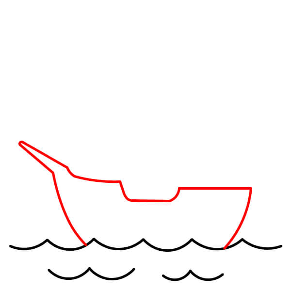Encima de las olas, dibuja el contorno principal del casco del barco. Esta forma debe ser redondeada en la parte inferior y extenderse hacia arriba, con una proa (frente) ligeramente puntiaguda y una popa (parte trasera) más vertical y cuadrada. El casco debe quedar parcialmente sumergido en las olas.