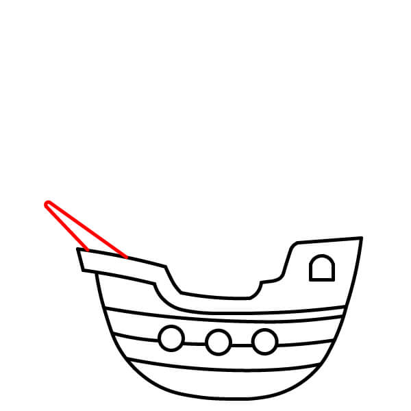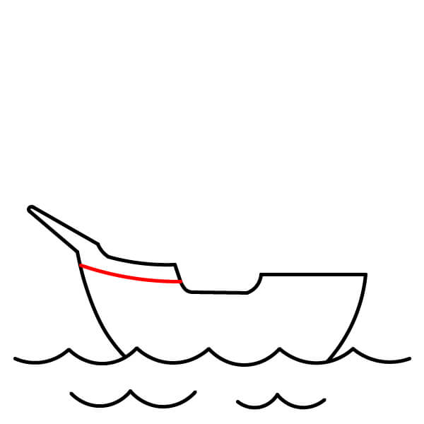 Dibuja una línea horizontal corta y curva cerca de la parte delantera (proa) del barco, justo debajo del borde superior del casco. Esto añade un poco de detalle a la estructura del barco.