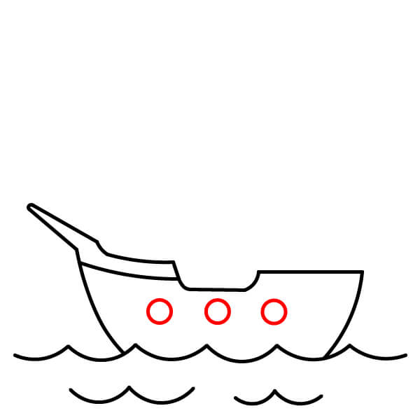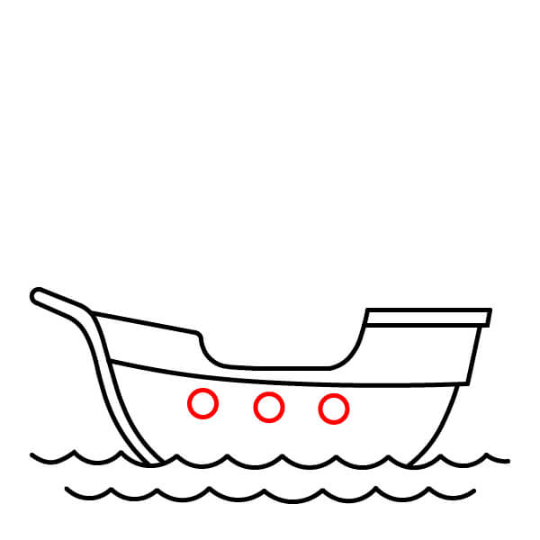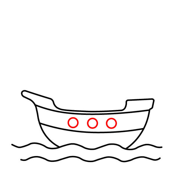 Dibuja tres pequeños círculos espaciados de manera uniforme a lo largo del costado del casco del barco. Estos representan las portillas o aberturas para los cañones.