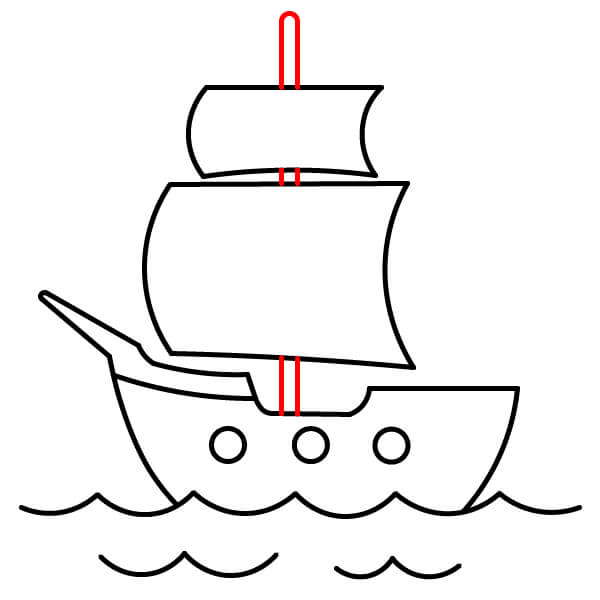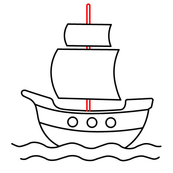 Dibuja una línea vertical que vaya desde la parte superior del casco hacia arriba, pasando por el centro de ambas velas. Este es el mástil del barco.