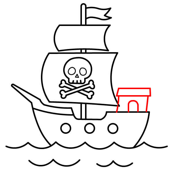 Dibuja una pequeña ventana redondeada con forma de “D” en la sección elevada del castillo de popa en la parte trasera del barco.