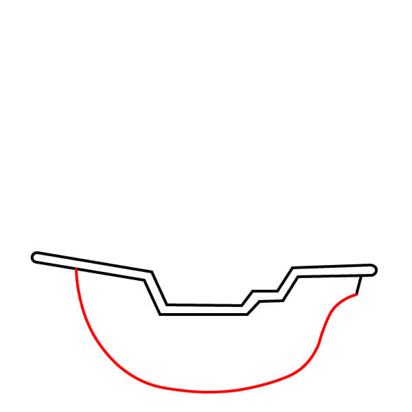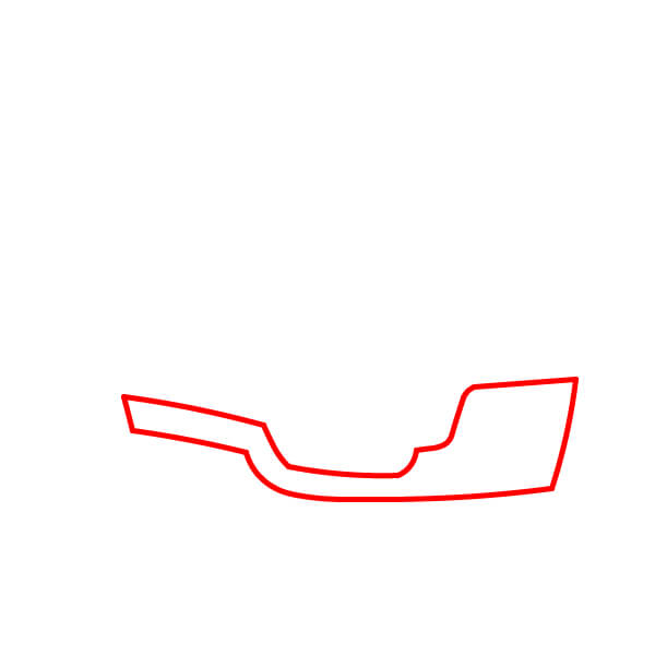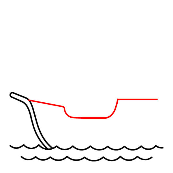 Dibuja la línea de la quilla y la estructura curva de la proa (parte delantera) del barco, asegurándote de que se extienda hacia abajo dentro del agua.
