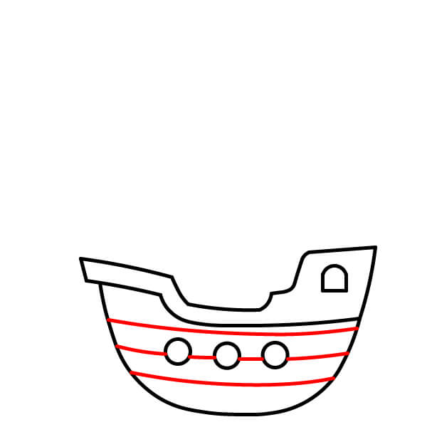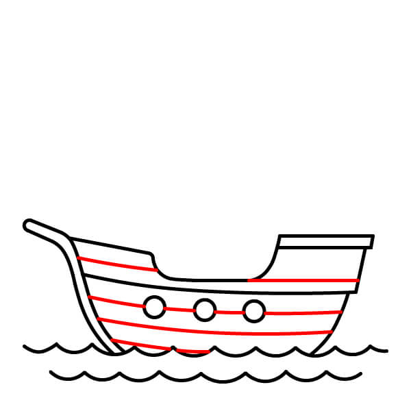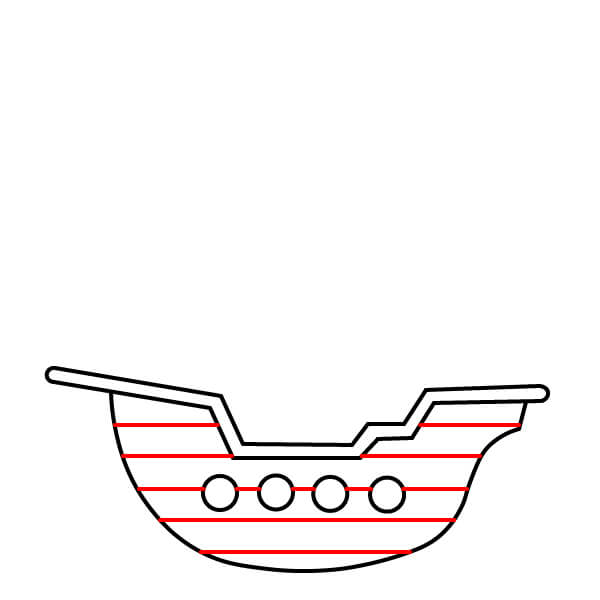Dibuja varias líneas horizontales a lo largo de todo el casco para representar las tablas de madera y las franjas del exterior del barco.