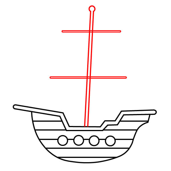 Dibuja varias líneas horizontales a lo largo del casco, tanto arriba como abajo de las portillas, para representar las tablas de madera.