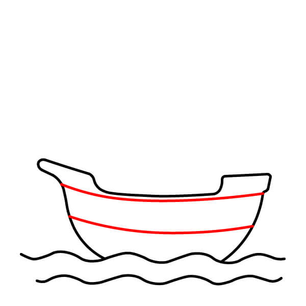 Añade dos líneas horizontales curvas a lo largo de la parte inferior del casco. Estas líneas ayudan a dar la impresión de las tablas de madera en el costado del barco.