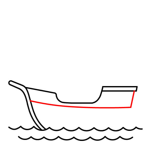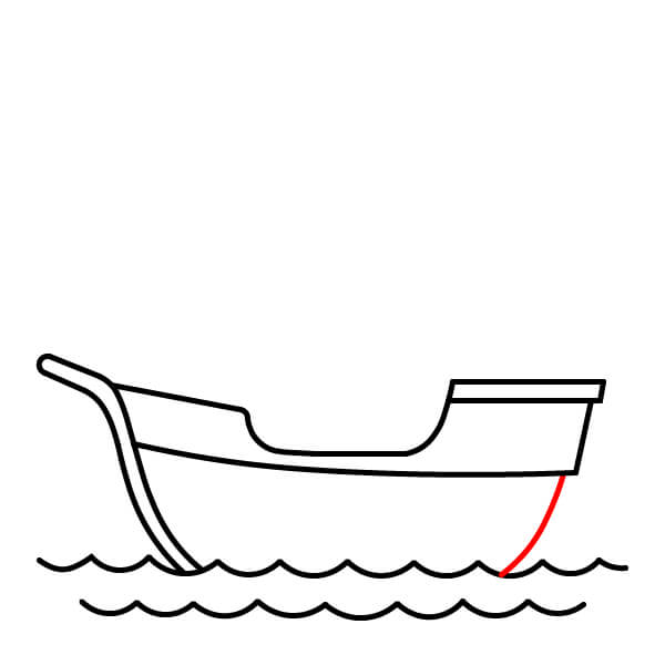 Dibuja una línea curva y vertical en la popa para conectar la parte trasera del casco con el agua, completando el cuerpo principal del barco.