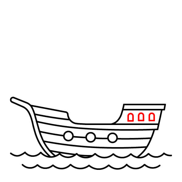 Dibuja tres pequeñas ventanas u aberturas rectangulares o arqueadas en el lado de la sección elevada de la popa.
