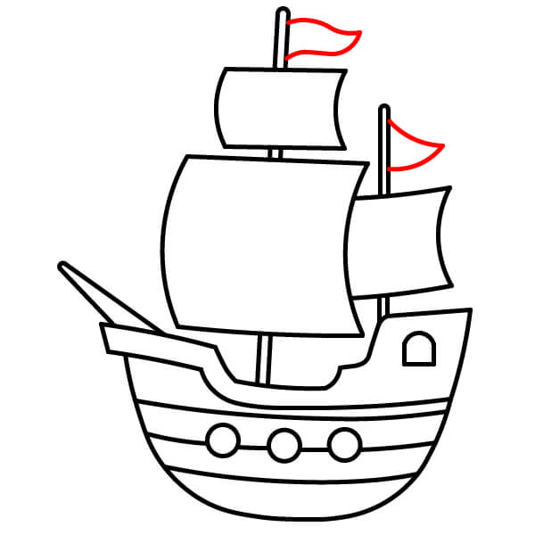 Dibuja los dos mástiles verticales pasando por las velas y conectándose con la cubierta. Añade las vergas para sostener las velas y dibuja un asta con una bandera roja en la parte superior del mástil más alto.