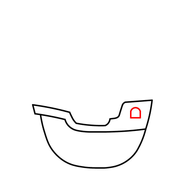 En la popa (parte trasera) del barco, dibuja una pequeña estructura de cabina rectangular. Debe tener un arco curvo que represente una puerta o ventana y un techo plano.