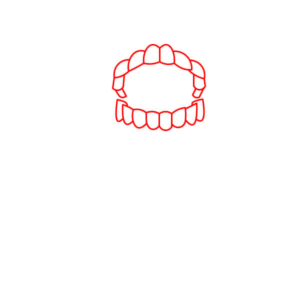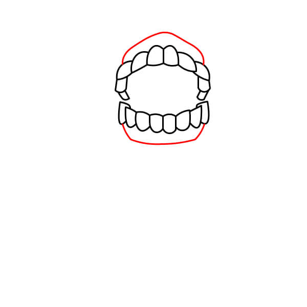 Dibuja una curva roja alrededor de los dientes para completar la forma de la boca/cabeza. Este contorno representa las encías o la estructura circundante.