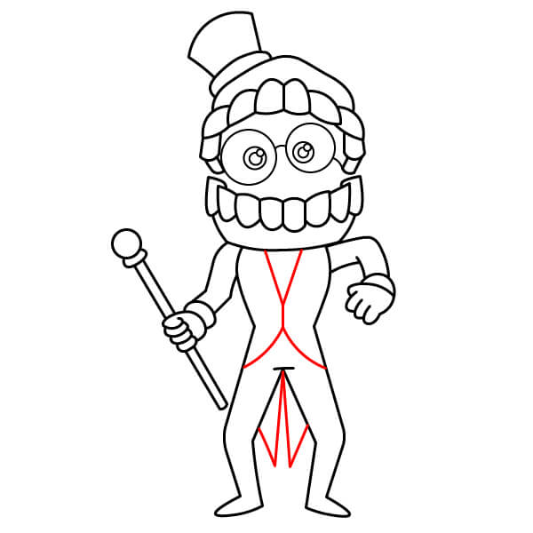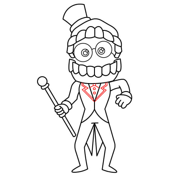 Añade los detalles finales al cuerpo de Caine para evocar su atuendo formal. Dibuja solapas y líneas en el torso para crear la forma del chaleco y la chaqueta. Usa líneas rectas y angulares para crear la ilusión de una cola dividida en la parte trasera de la chaqueta.