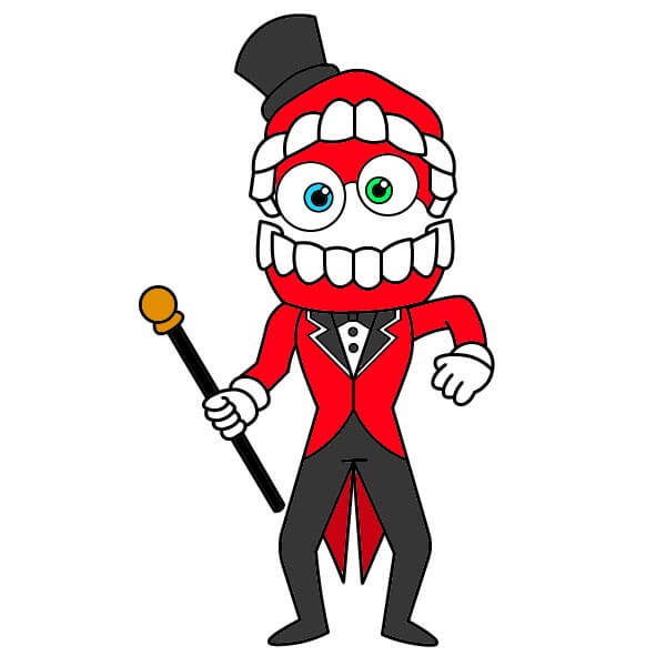 Para colorear a Caine, empieza por sus rasgos prominentes: colorea sus encías y cabeza de rojo brillante, pero mantén sus dientes de un blanco brillante. Sus ojos no son simétricos, así que colorea el fondo de un ojo de azul brillante y el otro de verde, y las gafas suelen ser de gris oscuro o negro. Para su atuendo formal, colorea el sombrero de copa, los pantalones y la parte principal del bastón de negro. Su traje es de un rojo que contrasta, mientras que el chaleco (en forma de V) y las manos enguantadas son blancas. Finalmente, colorea el orbe en la parte superior de su bastón de dorado o amarillo brillante.