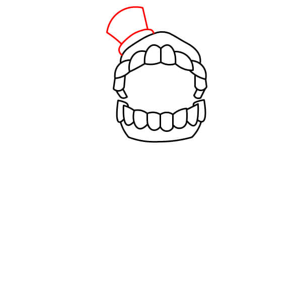 Comienza dibujando el contorno de las filas de dientes superior e inferior. Estas formarán la mayor parte de la cabeza de Caine. Los dientes deben dibujarse como cuadrados o rectángulos redondeados.