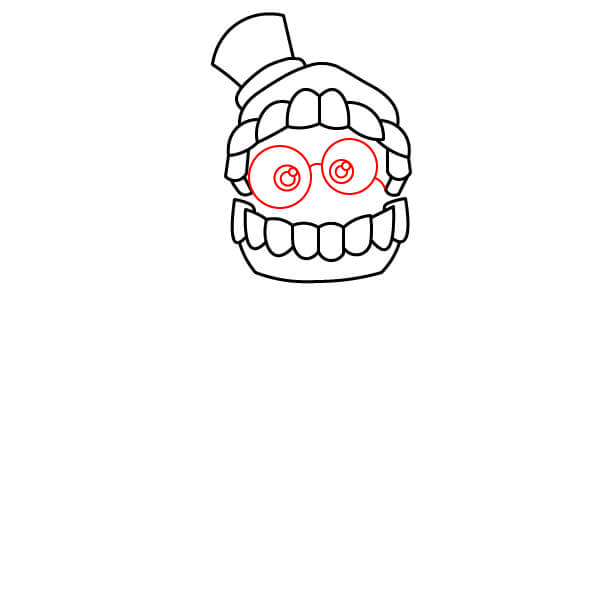 Dentro del espacio creado por los dientes, dibuja dos gafas circulares grandes con puente. Dentro de cada gafas, dibuja un círculo más pequeño para los globos oculares, asegurándote de que se vean grandes y ligeramente tontos.