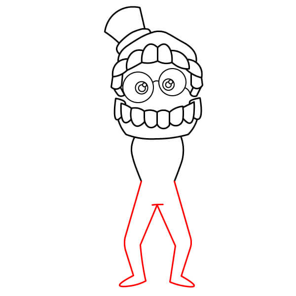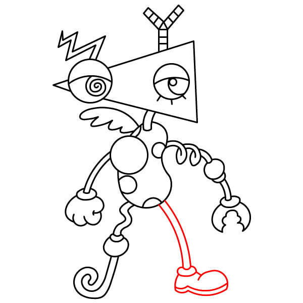 Dibuja la pierna derecha (a la izquierda del espectador). Esta pierna es más simple: una pierna recta y delgada que se extiende hacia abajo y termina en una gran bota de estilo cómic con puño.