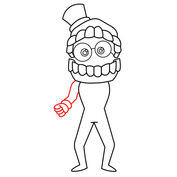 Dibuja el brazo izquierdo (a la derecha del espectador). Este brazo tiene una forma cilíndrica simple que se extiende desde la rótula del torso y termina en un puño y un gran puño enguantado (como un guante de boxeo).