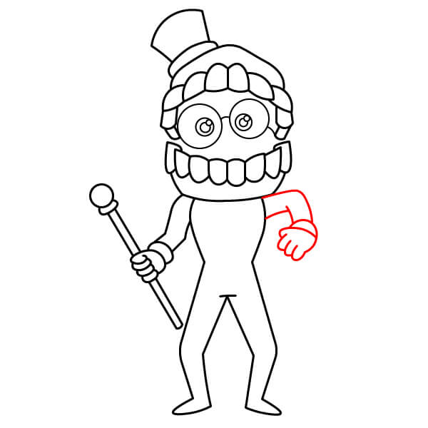 Dibuja el brazo derecho (desde la perspectiva del espectador) extendido hacia afuera del cuerpo. El brazo debe doblarse a la altura del codo, terminando en un puño redondeado y líneas simples para los dedos.