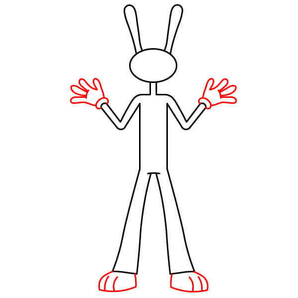 Dibuja dos manos que sobresalgan de los brazos. Deben ser grandes, estar extendidas y llevar guantes (como se muestra en el contorno de la muñeca). En la parte inferior, dibuja dos pies grandes y redondos y añade una línea cerca de la parte superior para indicar la parte inferior de los pantalones/calcetines.