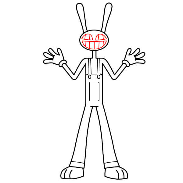 ¡Dibuja la sonrisa traviesa de Jax! Dibuja una curva larga y ancha en la mitad inferior de su cabeza para formar la boca. Rellena esta zona con dientes grandes y cuadrados y dos líneas pequeñas dentro de la boca para definir las encías/el interior.