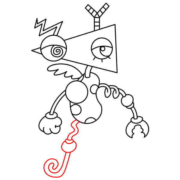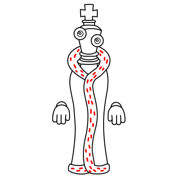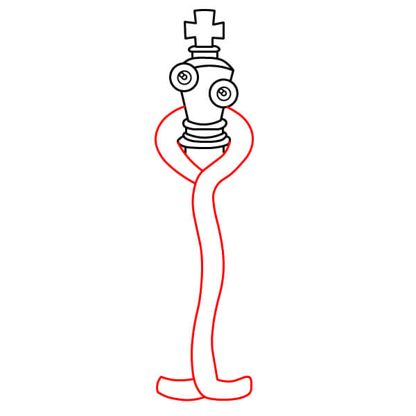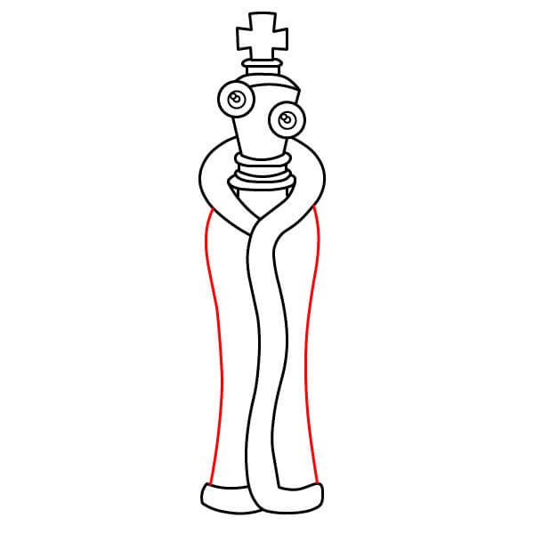 Debajo del cuerpo en espiral, dibuja dos patas de cinta. Deben ser tiras de cinta largas y curvas, similares a los brazos, que terminan en pies redondos simples. Se unen a la parte inferior del cuerpo en espiral.