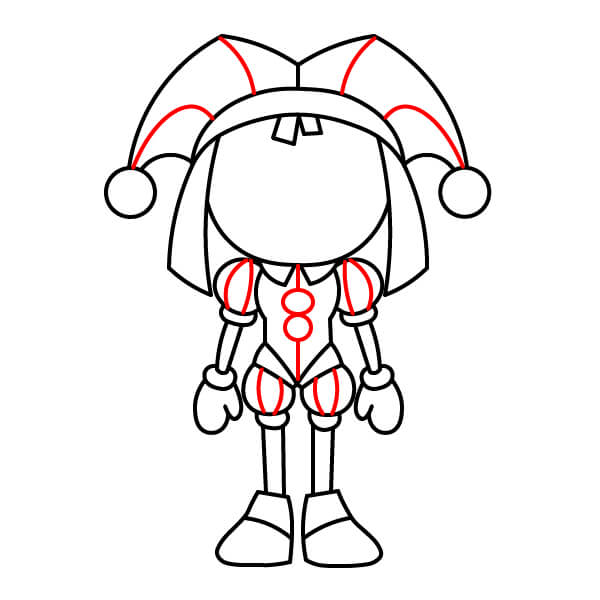 Dibuja una línea vertical por el centro del torso. Dibuja dos círculos pequeños en el centro para representar los botones o broches. Agrega curvas a la solapa del sombrero de payaso, creando un efecto de color dividido. Agrega curvas verticales a las mangas y pantalones abullonados para definir las secciones de color separadas.
