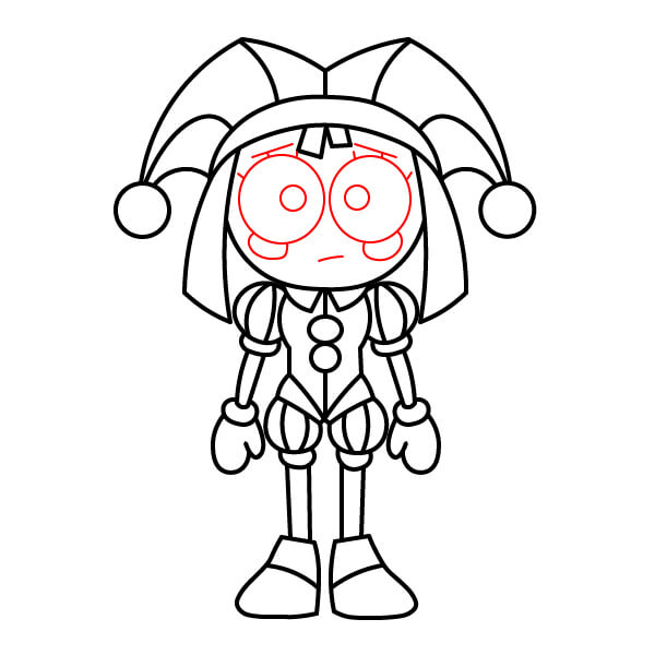 Añade los detalles finales al rostro de Pomni: Dibuja ojos grandes, amplios y tristes con pupilas pequeñas y una boca sencilla y fruncida. Añade cejas y un toque de rubor debajo de cada ojo.
