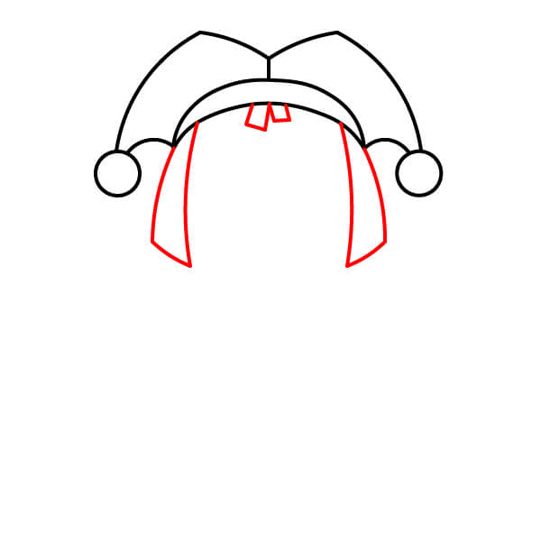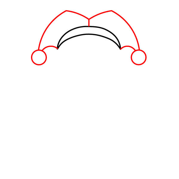 Dibuja la parte superior del sombrero de payaso, que consta de dos solapas curvas y puntiagudas que sobresalen de la banda. Agrega un círculo o una campana al final de cada solapa.