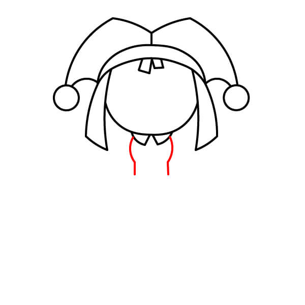 Dibuja un óvalo grande dentro del sombrero para la cabeza de Pomni. Agrega las solapas laterales del sombrero (que parecen dos trenzas) para enmarcar la cara. También dibuja dos pequeños dientes frontales en el centro de la parte superior de la cabeza.