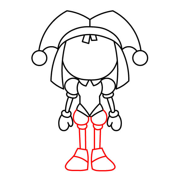 Dibuja dos piernas cortas y delgadas que se extiendan desde la parte inferior del mono. Agrega los pantalones cortos o abullonados justo por encima de las rodillas. Completa dibujando botas o zapatos grandes y redondos en los extremos de las piernas.