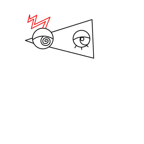 Sobre el primer ojo, dibuja un zigzag o un rayo que se extienda hacia arriba para representar parte del cabello o la estructura de la cabeza.