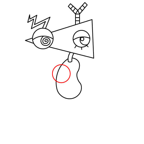 Dibuja el primer segmento del cuerpo debajo de la cabeza. Es una forma grande y asimétrica, similar a un frijol o un riñón, unida a la cabeza por un pequeño tubo.