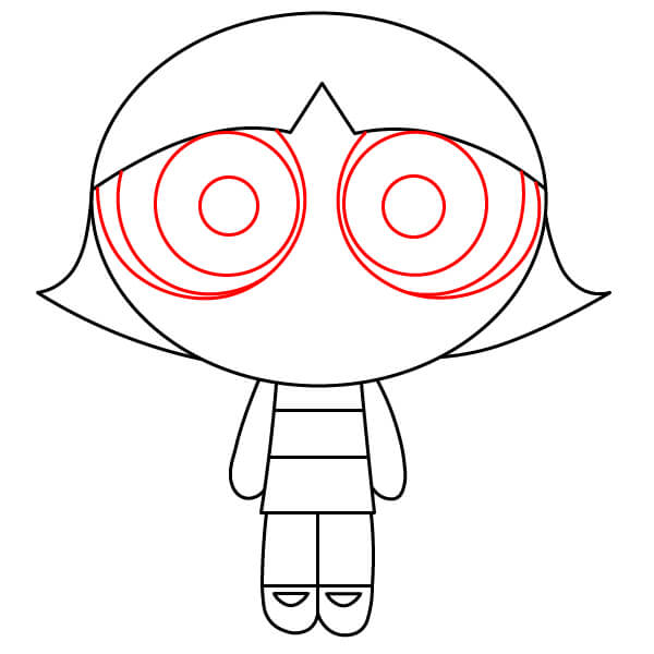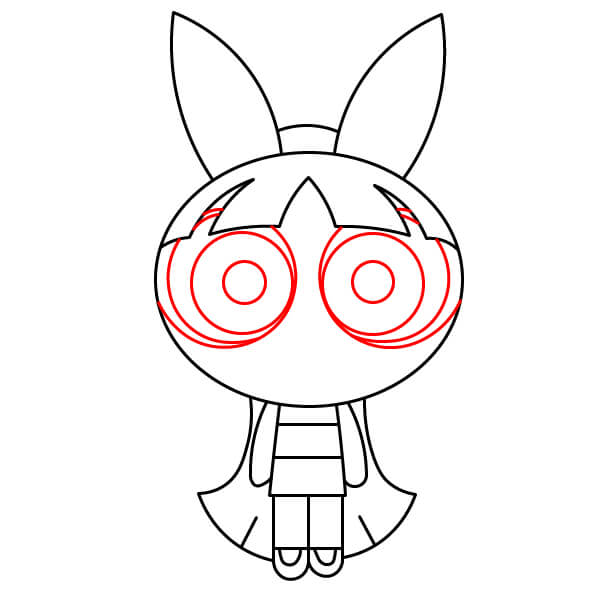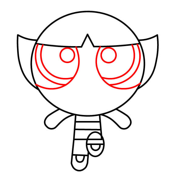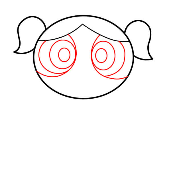 Paso 8: Dentro de la cabeza, dibuja dos grandes círculos concéntricos para los ojos. Agrega pequeños círculos blancos dentro para representar los reflejos.