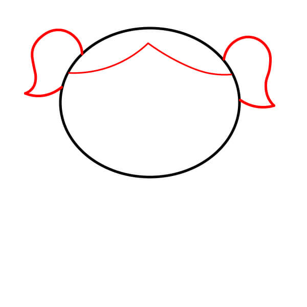 Paso 2: Agrega el cabello. Dibuja una línea curva en la parte superior de la cabeza para el flequillo. A cada lado de la cabeza, dibuja una forma curva para el cabello recogido en coletas.
