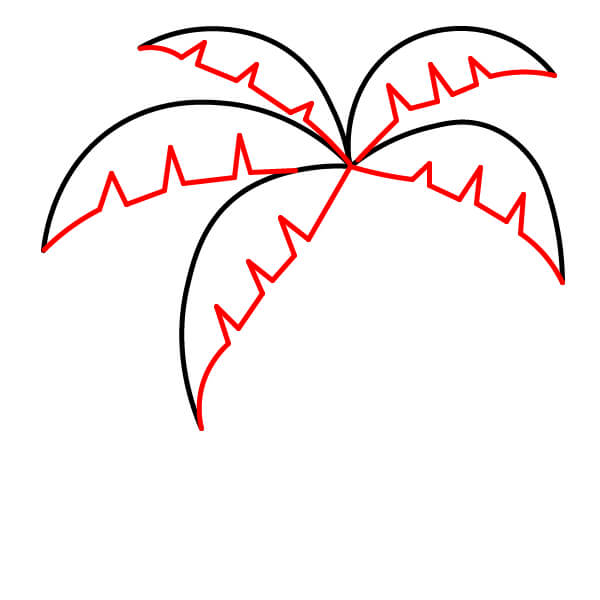 Alrededor de cada línea curva del paso anterior, dibuja una forma dentada parecida a una hoja para crear las hojas de la palmera. Asegúrate de conectar los bordes exteriores para formar una hoja completa.