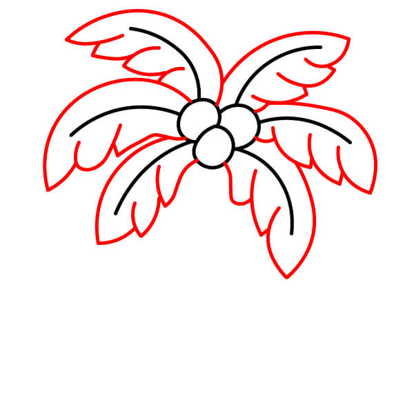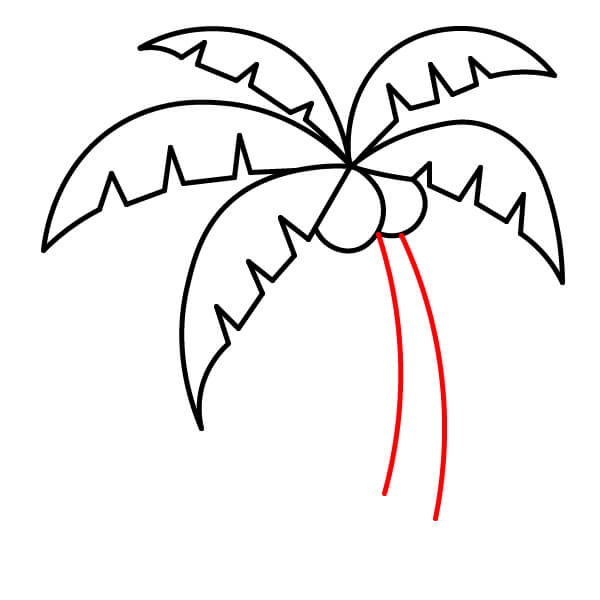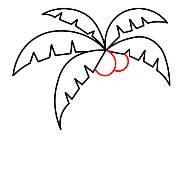 Luego, dibuja dos medios círculos superpuestos justo debajo del centro de las hojas. Estos representarán los cocos colgando del árbol.