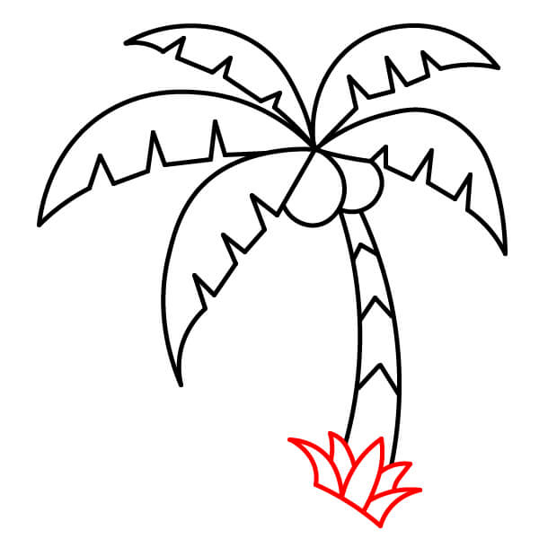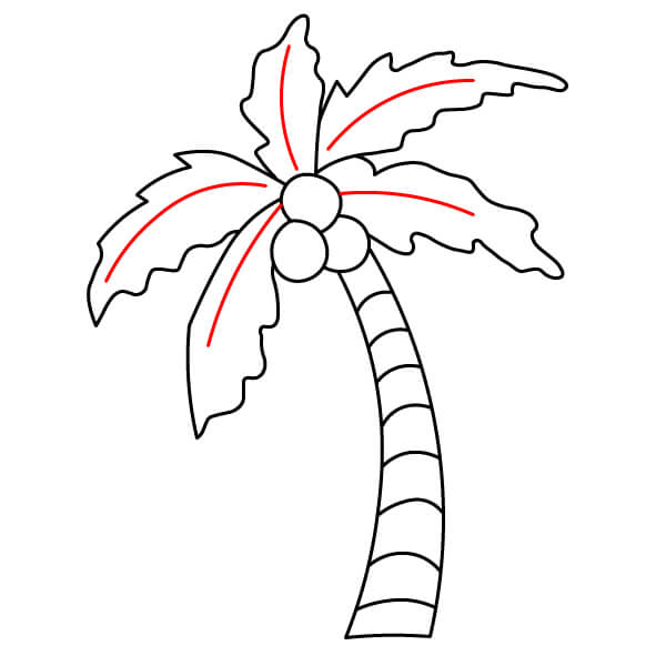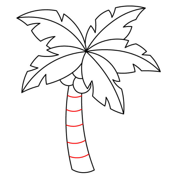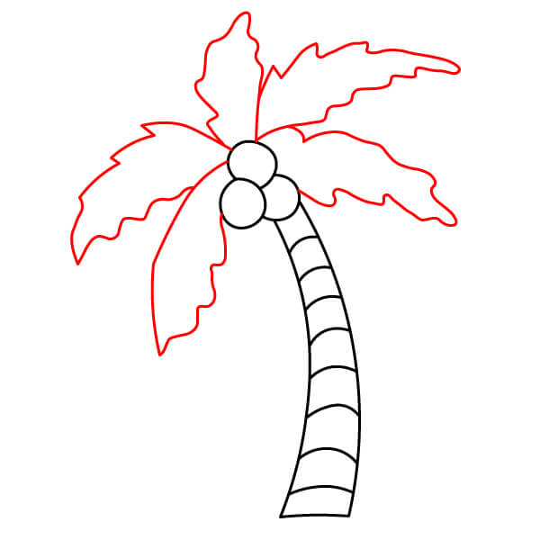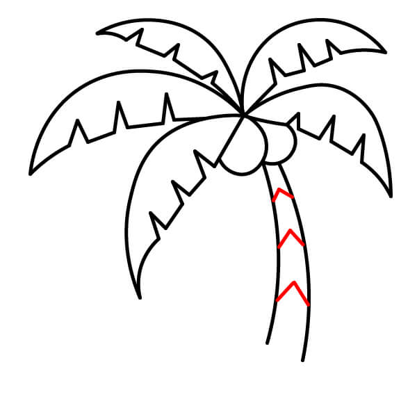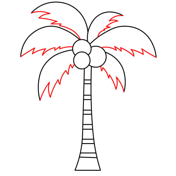 Alrededor de cada uno de los tallos que dibujaste en el paso anterior, traza el contorno de las hojas de la palmera. Hazlas con una forma dentada, como hojas. No olvides añadir algunas líneas curvas en el interior de las hojas para darles un poco de textura.