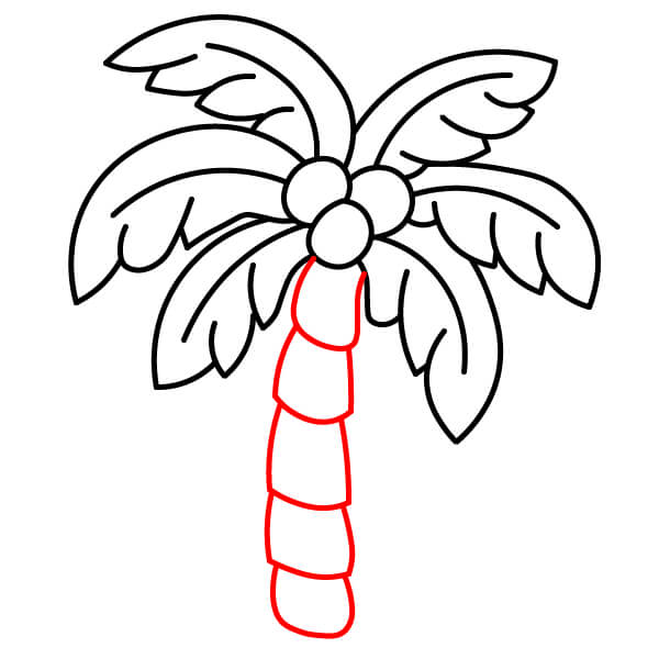 Debajo de los cocos, dibuja dos líneas largas y ligeramente curvas que se unan en la parte inferior para formar el tronco de la palmera. El tronco debe ser más ancho en la base y un poco más estrecho en la parte superior.
