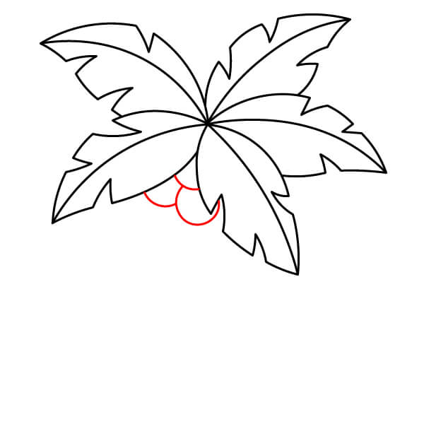 Debajo de las hojas, dibuja tres círculos superpuestos para representar los cocos.
