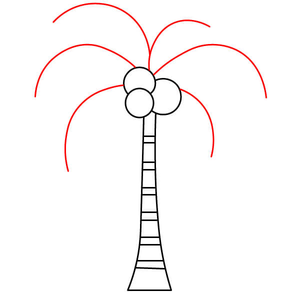 Desde el área justo encima de los cocos, dibuja varias líneas largas y curvas que se extiendan hacia afuera. Estas serán los tallos principales de las hojas de la palmera.