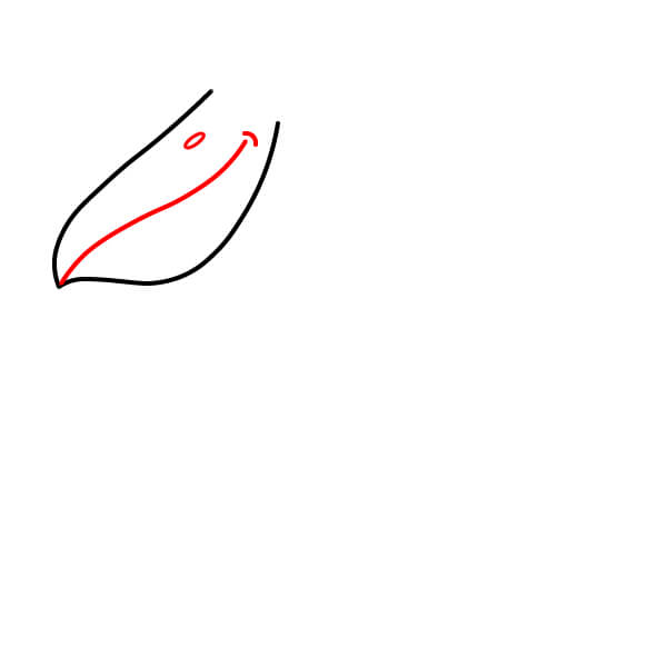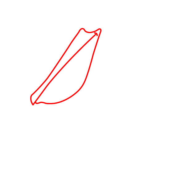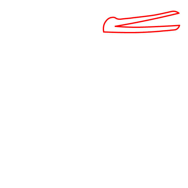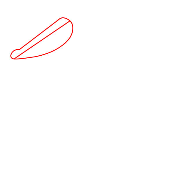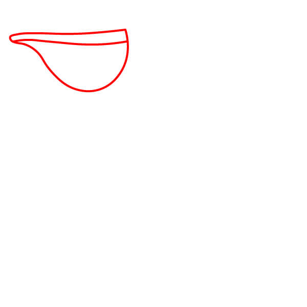 Dibuja una forma alargada y ligeramente curvada para el pico cerrado. Incluye una pequeña curva redondeada en la punta. Dibuja una línea diagonal en el interior para separar la parte superior de la inferior del pico.
