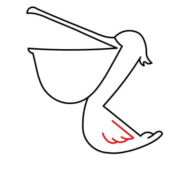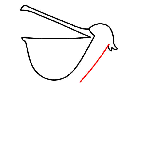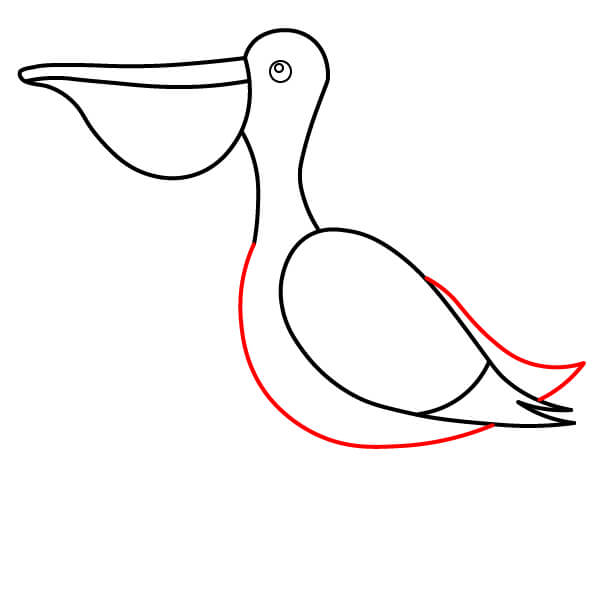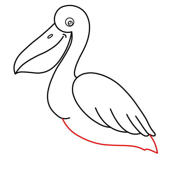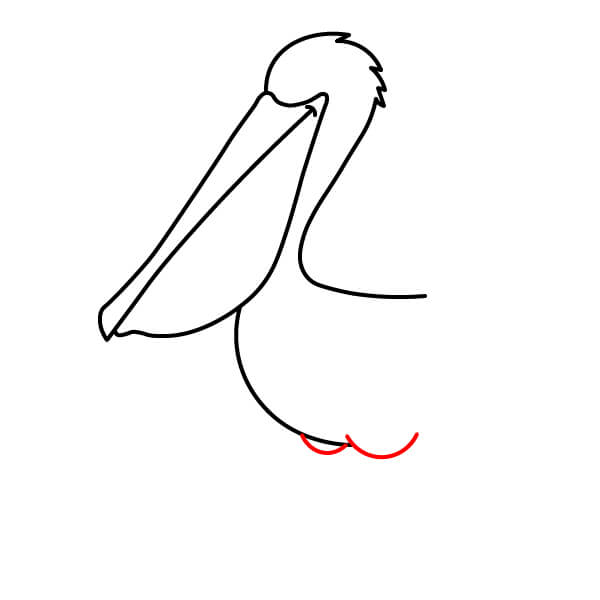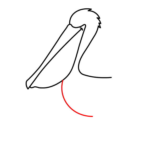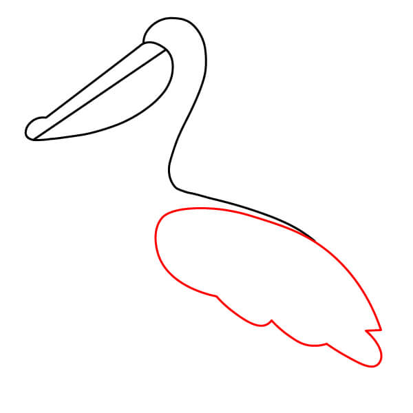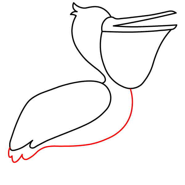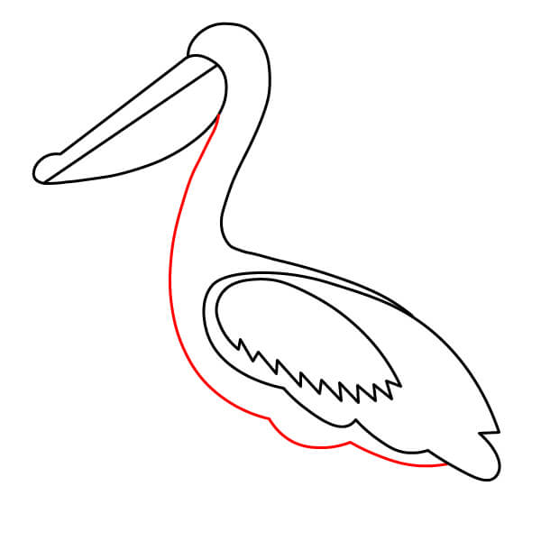 Dibuja una línea larga y curva desde la parte inferior de la bolsa gular, que se extienda hacia abajo y se conecte con la parte inferior del cuerpo. Añade algunas líneas onduladas más en la parte posterior para definir mejor las plumas de la cola.