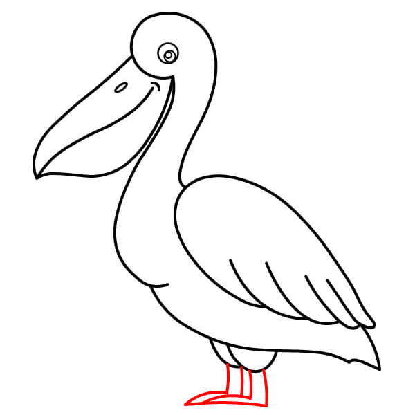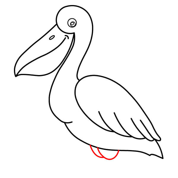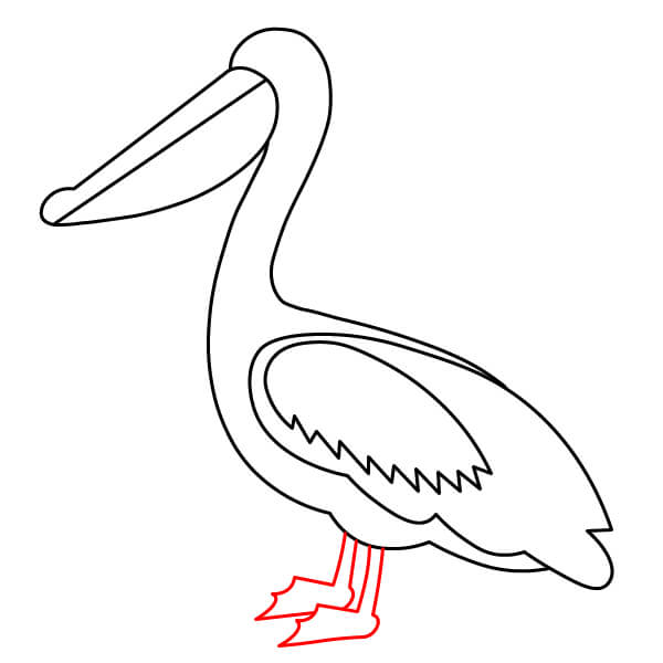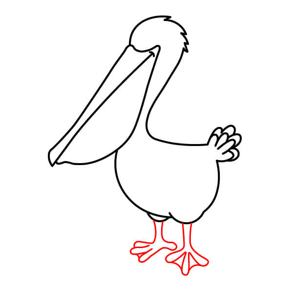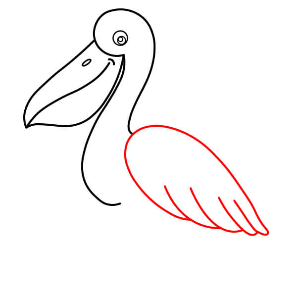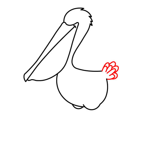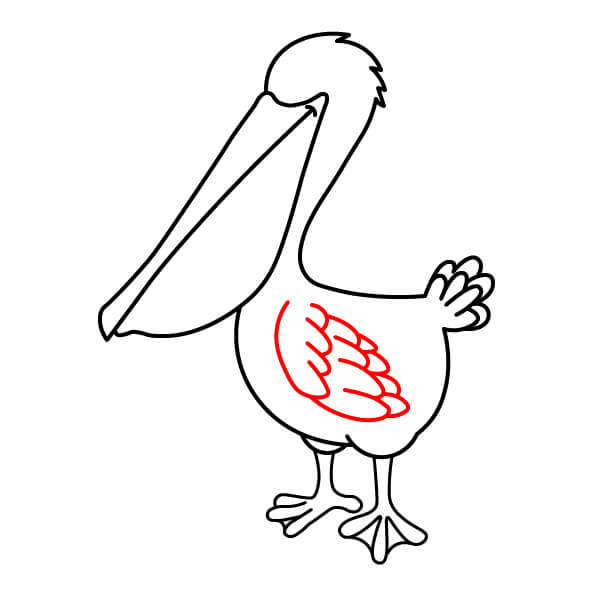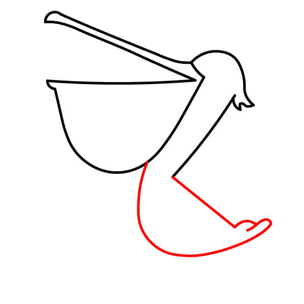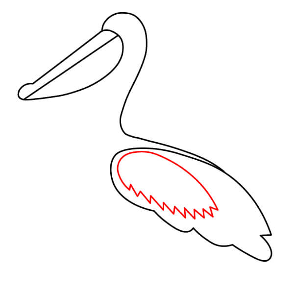 Dibuja una línea larga y curva desde la parte inferior de la bolsa gular, que se extienda hacia abajo y se conecte con la parte inferior del cuerpo. Añade algunas líneas onduladas más en la parte posterior para definir mejor las plumas de la cola.