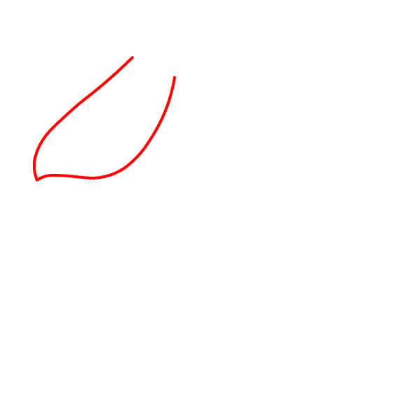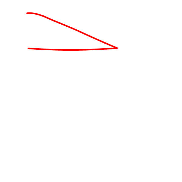 Comienza dibujando dos líneas largas, ligeramente curvas y paralelas que se unen en un punto, formando las partes superior e inferior abiertas del pico del pelícano. Añade una pequeña curva redondeada en la parte posterior para la bisagra del pico.