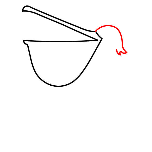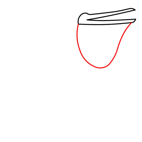 Dibuja una línea inferior correspondiente para la parte inferior del pico abierto, ligeramente curvada. Debajo, dibuja una curva grande y profunda en forma de U que se conecte con el pico, formando la característica bolsa gular.
