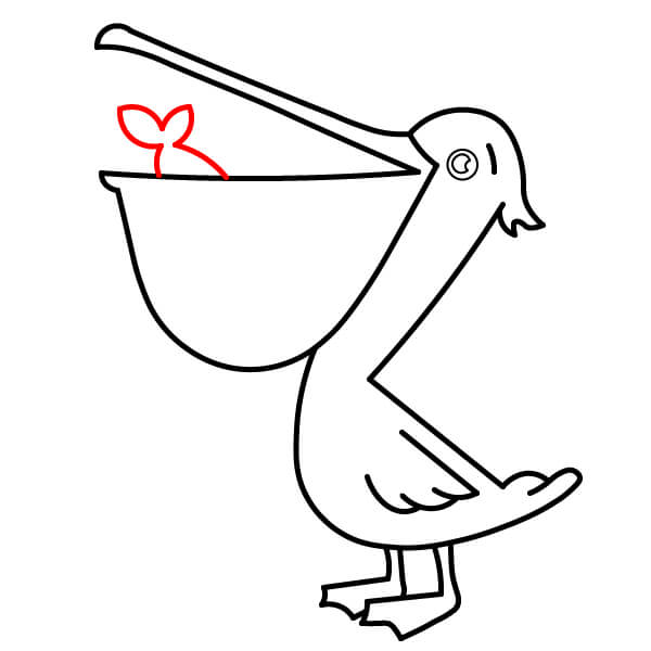 Dentro de la bolsa abierta, dibuja un pez pequeño y sencillo. Puede ser un óvalo básico con aleta caudal, sugiriendo que el pelícano acaba de cazar.